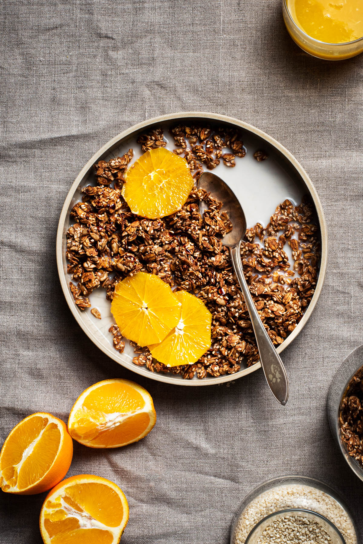 - Keep an eye out: this granola is quite dark to begin with, so keep a close eye to make sure it doesn’t burn. The colour doesn’t change so much after baking and it’s better to watch the time than look for golden colour for this recipe.